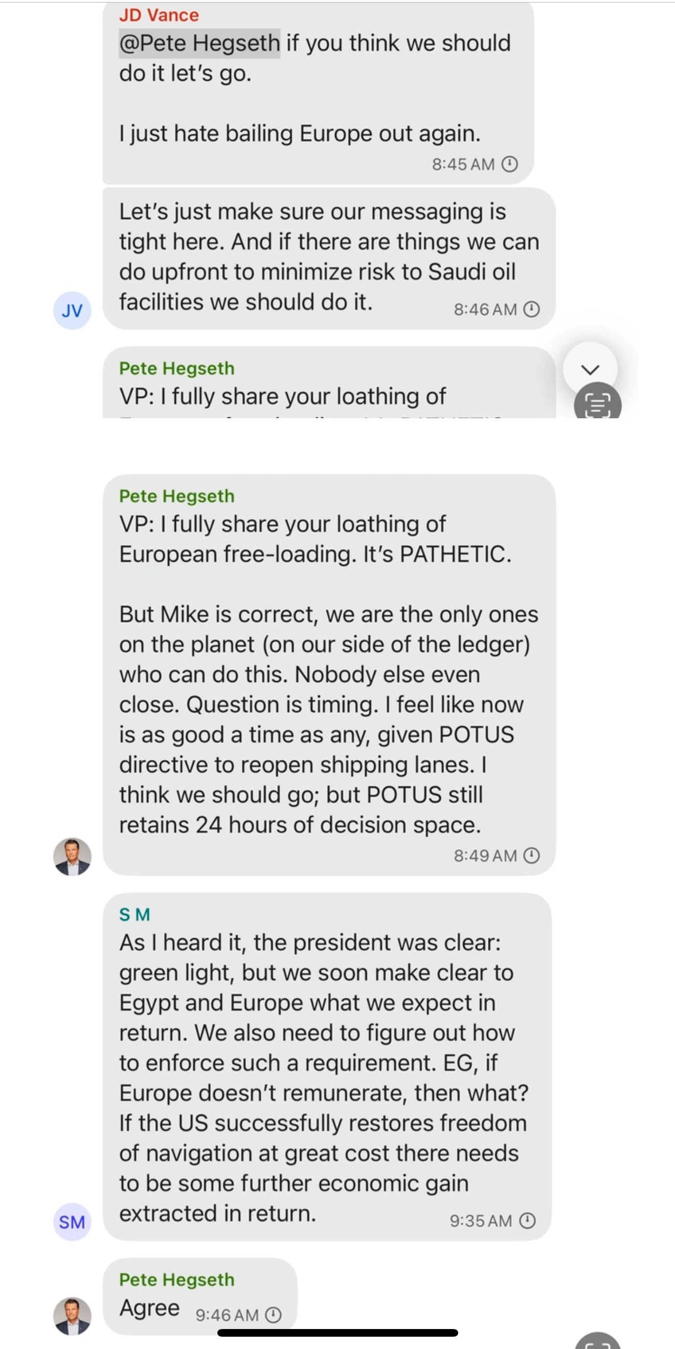 Waiting a few weeks or a month does not fundamentally change the calculus. 2 immediate risks on waiting: 1) this leaks, and we look indecisive; 2) Israel takes an action first – or Gaza cease fire falls apart – and we don’t get to start this on our own terms. We can manage both. We are prepared to execute, and if I had final go or no go vote, I believe we should. This [is] not about the Houthis. I see it as two things: 1) Restoring Freedom of Navigation, a core national interest; and 2) Reestablish deterrence, which Biden cratered. But, we can easily pause. And if we do, I will do all we can to enforce 100% OPSEC”—operations security. “I welcome other thoughts.