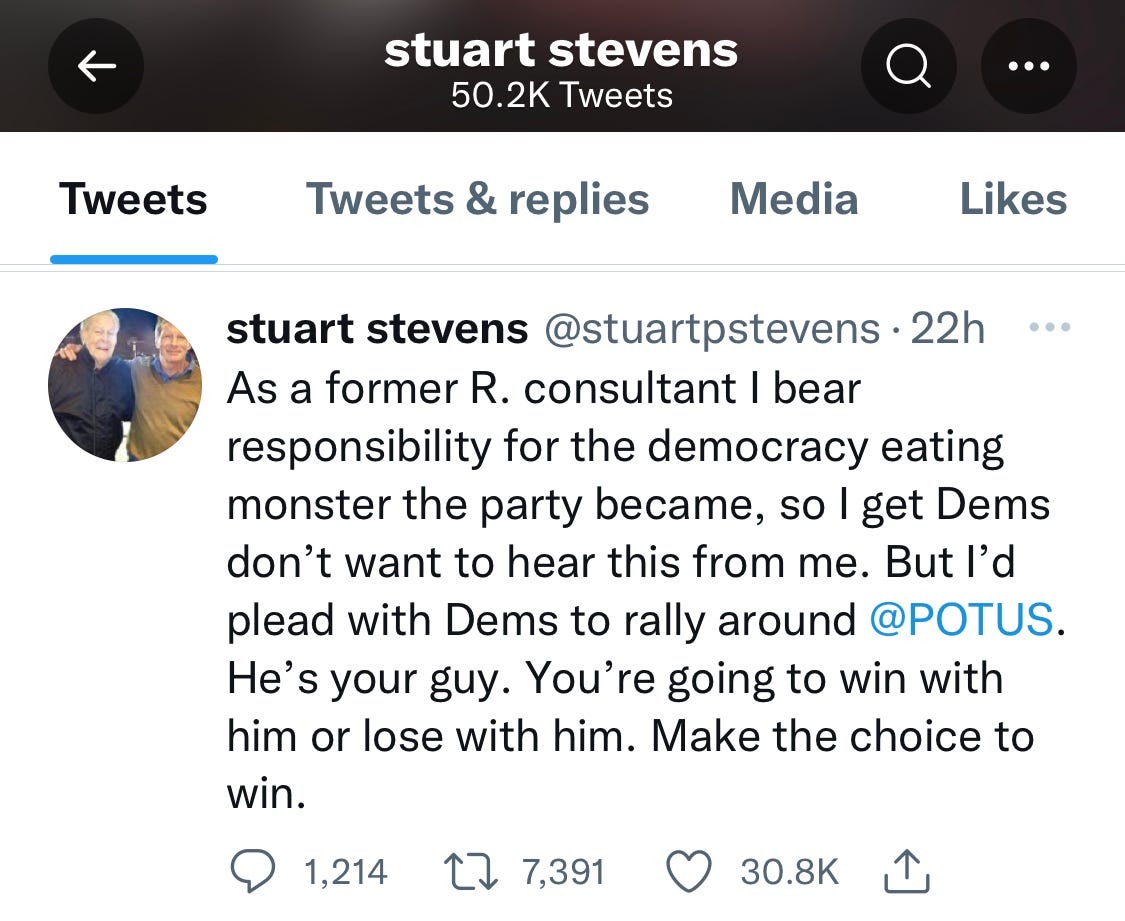 Here is the place where my friend and former colleague Stuart Stevens have different views.