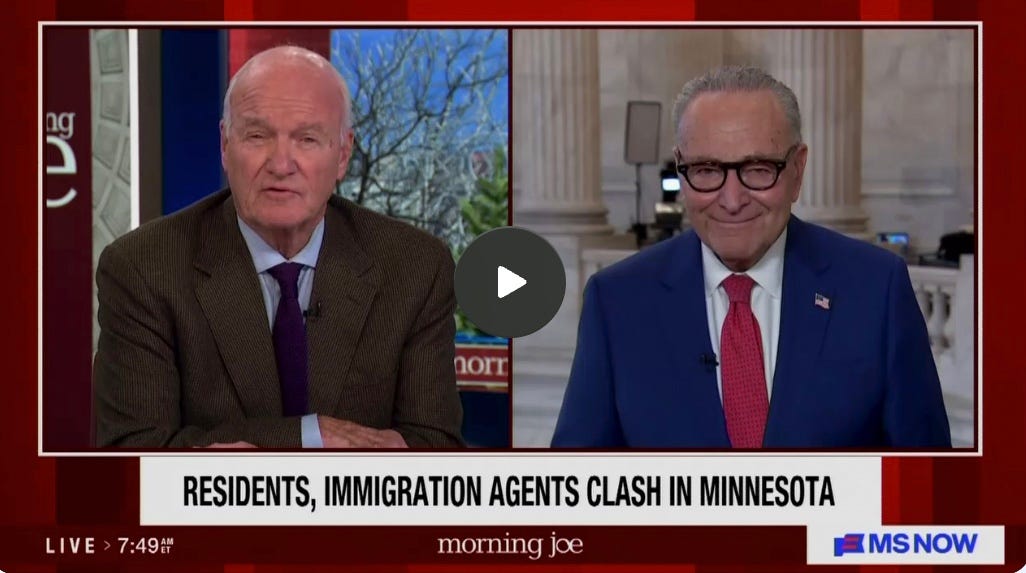 Chuck Schumer allowed the ICE army to be funded, and has permitted the most extraordinary abuses of civil liberties in American history because he is indifferent. That is his sin, and it will be his awful legacy, paid for by my children, who will suffer because of the Democratic Party’s guilty men and women who lost two out of three elections to Donald Trump, and then appeased him as he destroyed the rule of law in the United States.