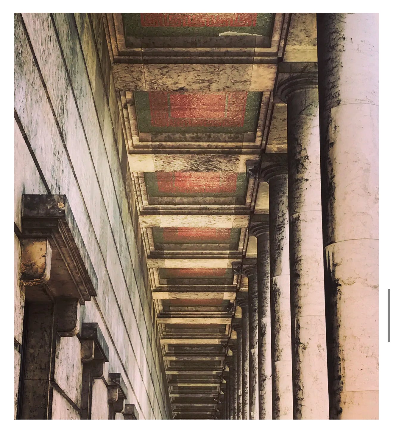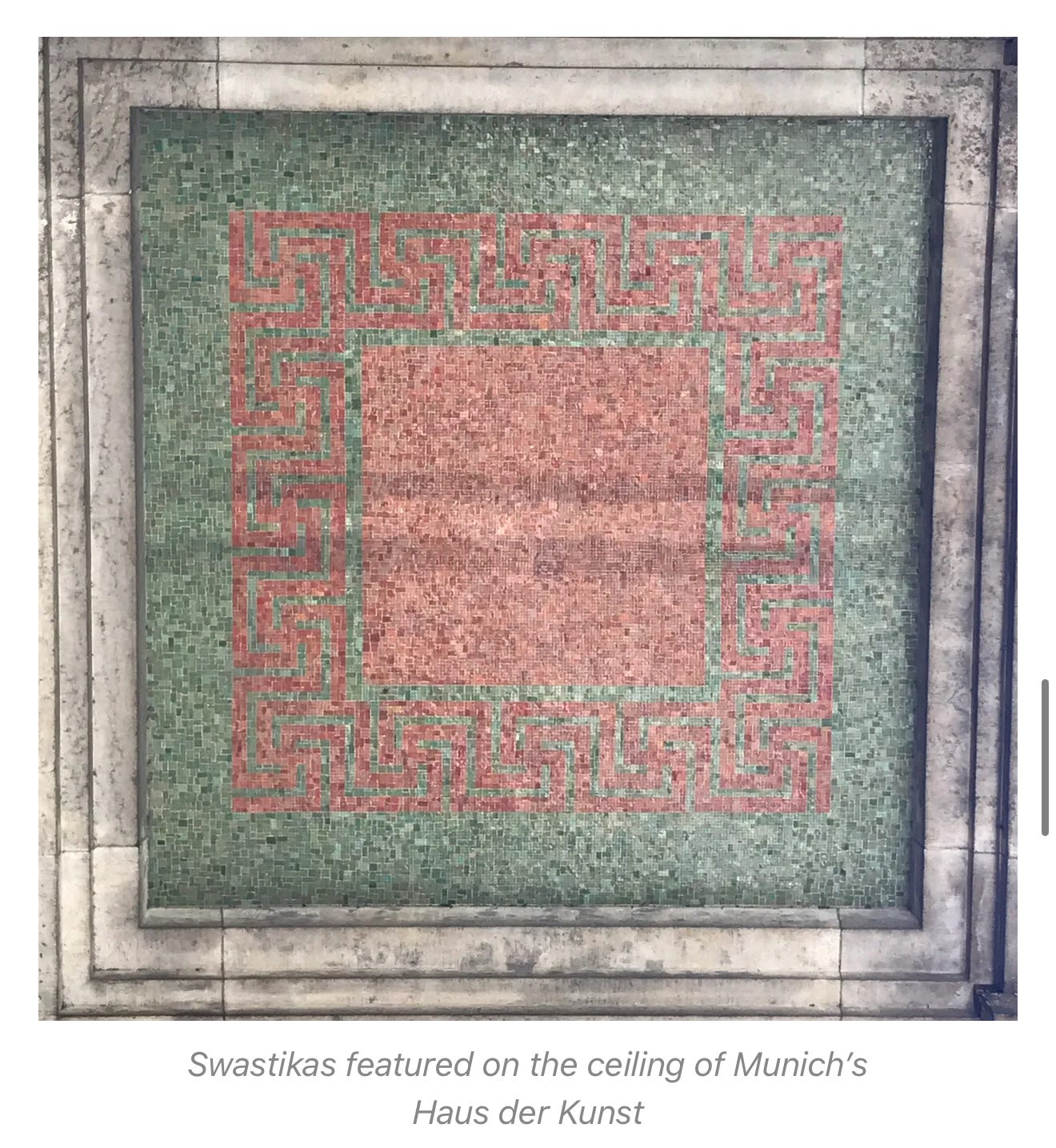 After reunification in the 1990s somebody decided to look up one day at the inlaid ceiling mosaic under the portico. They saw an astonishing sight. There were swastika mosaics that covered the entire roof of the portico.