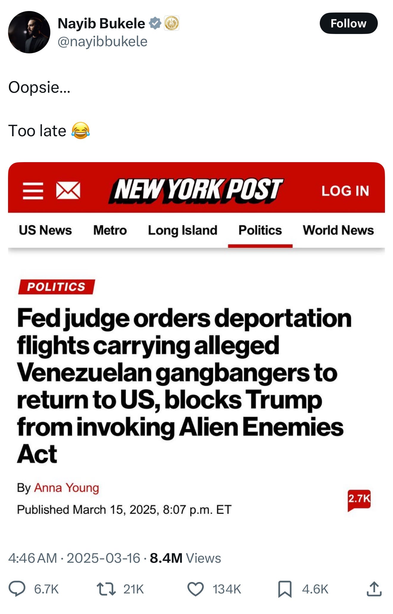 And this is Bukele’s post on X, daring to taunt a federal judge in the United States when the Trump administration refused to comply with the judge’s order, and basically sold hundreds of men to El Salvador with no due process rights at all: