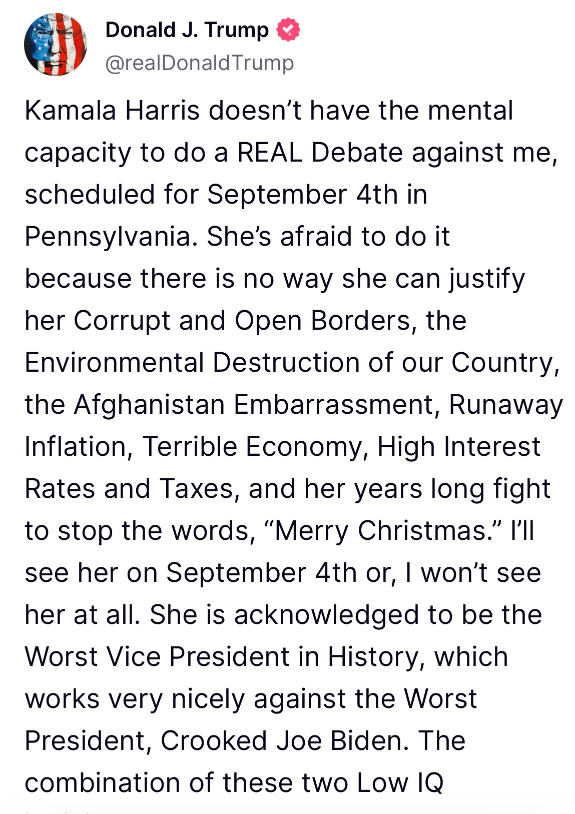 VP Harris doesn’t need the debate, but Trump does. He’s losing. He needs oxygen, and I’d make sure the line was cut.