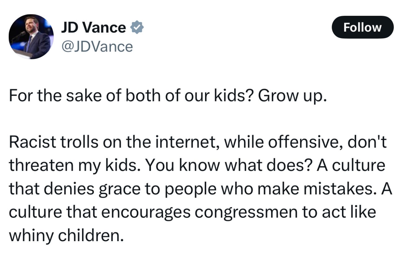 Racist trolls on the internet, while offensive, don’t threaten my kids. You know what does? A culture that denies grace to people who make mistakes,” Vance wrote. “A culture that encourages congressmen to act like whiny children.”