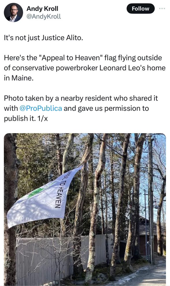 American politics and culture are filled with trivialities that are routinely covered as revelations. This has numbed multitudes into a fog of confusion about what matters and what doesn’t. These flags matter a great deal, and anyone who says their flying above the homes of Alito and Leo is a small thing is as blind as they are corrupt, seditious and arrogant.