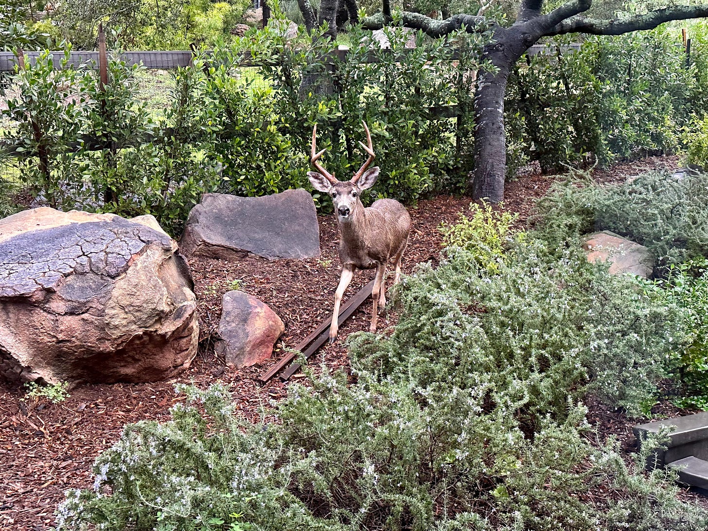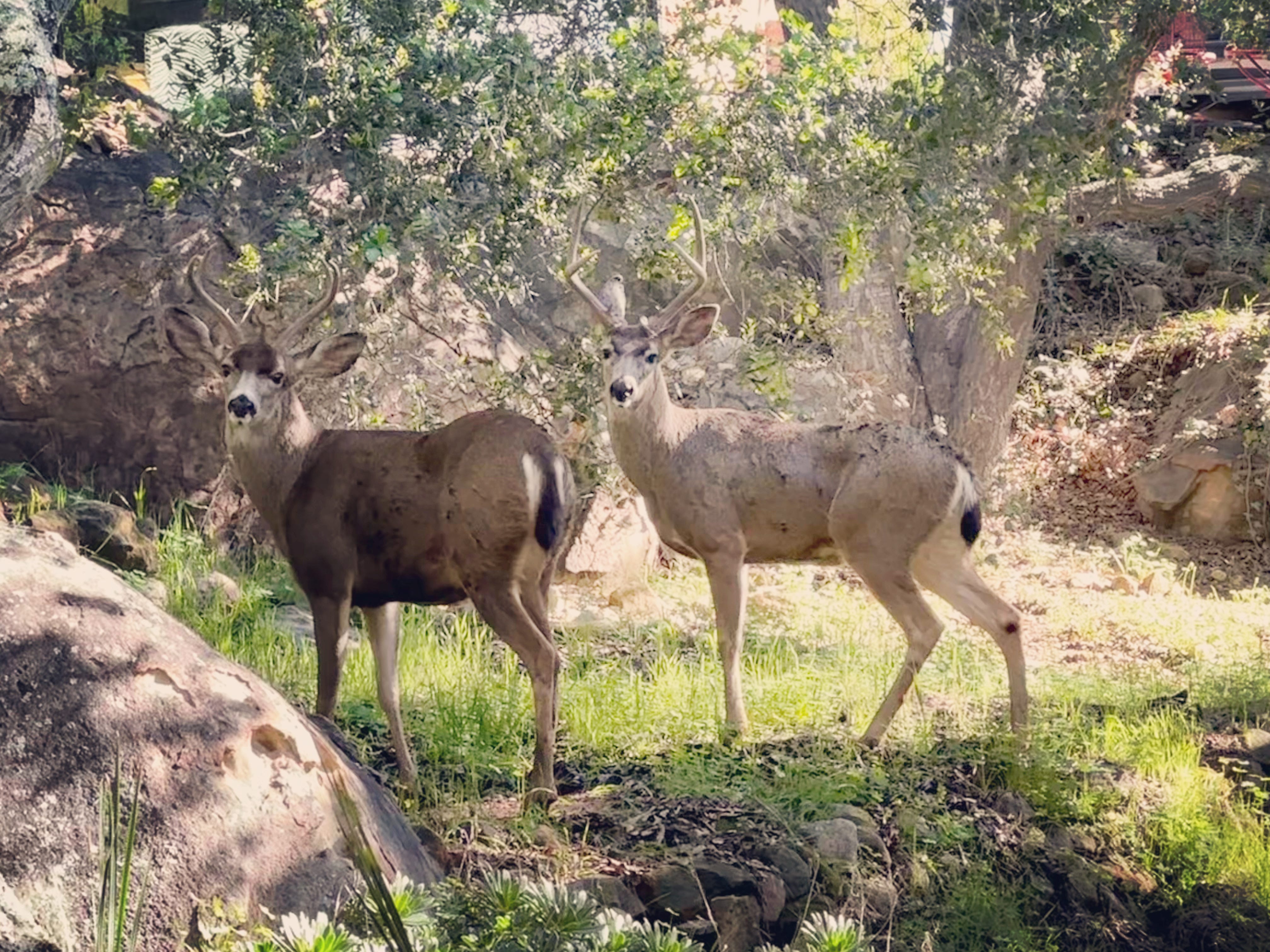 The two grand bucks in the top photo are perfectly camouflaged in the environment, vigilant, and in sync with each other. Balance and Beauty. We humans have much to learn from them. Thank You.