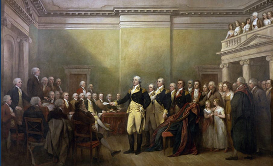 This painting by John Trumbull of General Washington resigning his commission hangs in the rotunda of the United States Capitol. Notice the chair larger than the rest draped with a cloak.