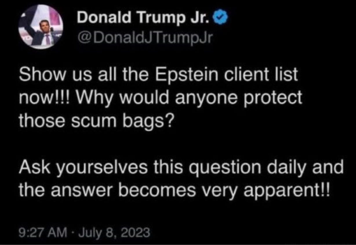 If only his dumb-as-rocks supporters would show equal outrage over Trump's unlawful kidnapping and deportation of people off the streets, even citizens, without due process, and shipping them to some of the worst prisons in the world while building his own concentration camps right here at home, bizarre arrests of those in congress, threats to strip U.S. citizenship of his critics... just the tip of the iceberg of Trump's ongoing lawless, and evil ways that any sane human would be screaming to high heaven about.... not just this missing "list."