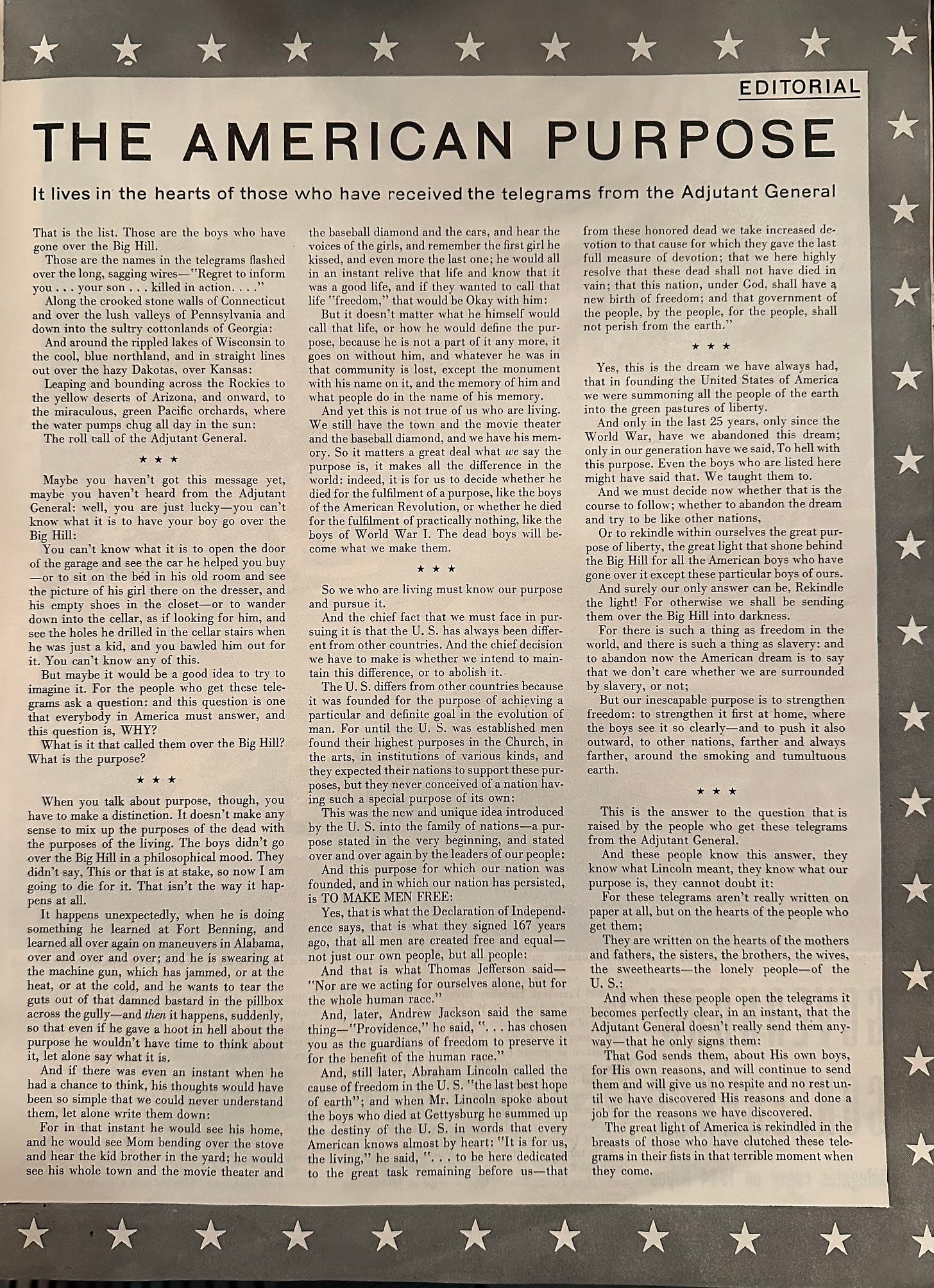 Eighty-one years ago, in the middle of the storm, thrashed by doubt, at the edge of tremendous sacrifice a great magazine put forward a deep question about the American purpose that I am pleased to share with you on the eve of this Thanksgiving.