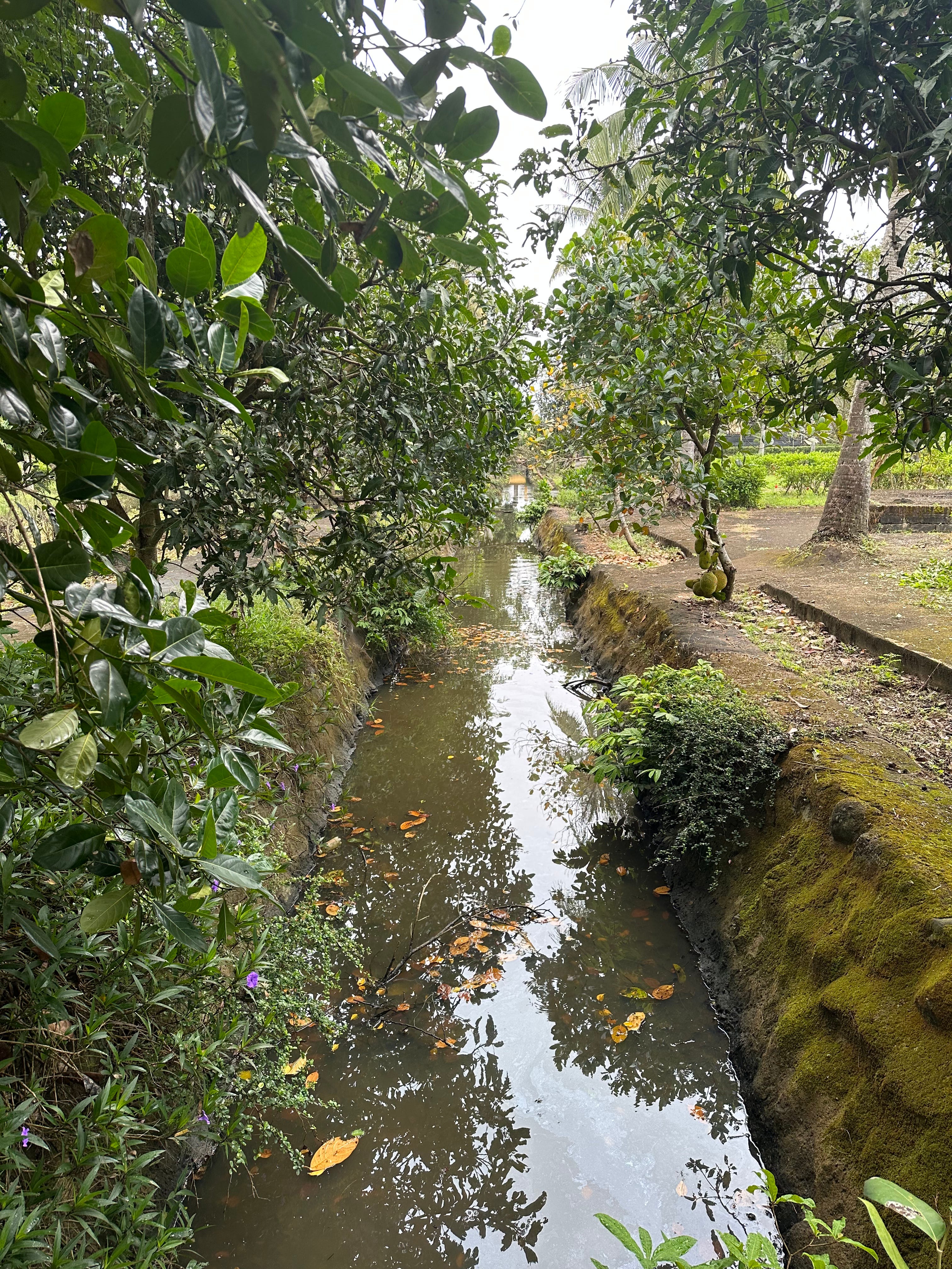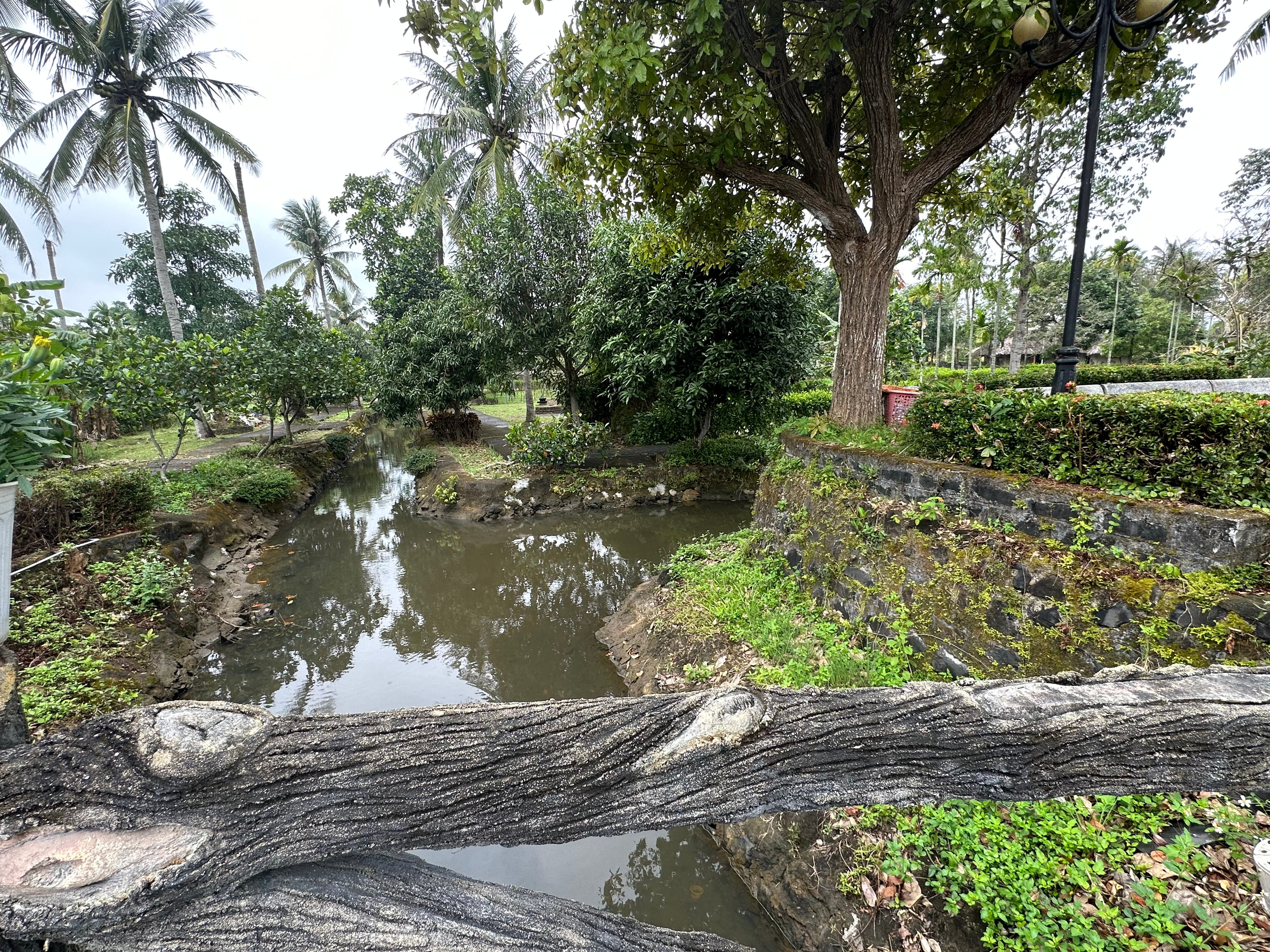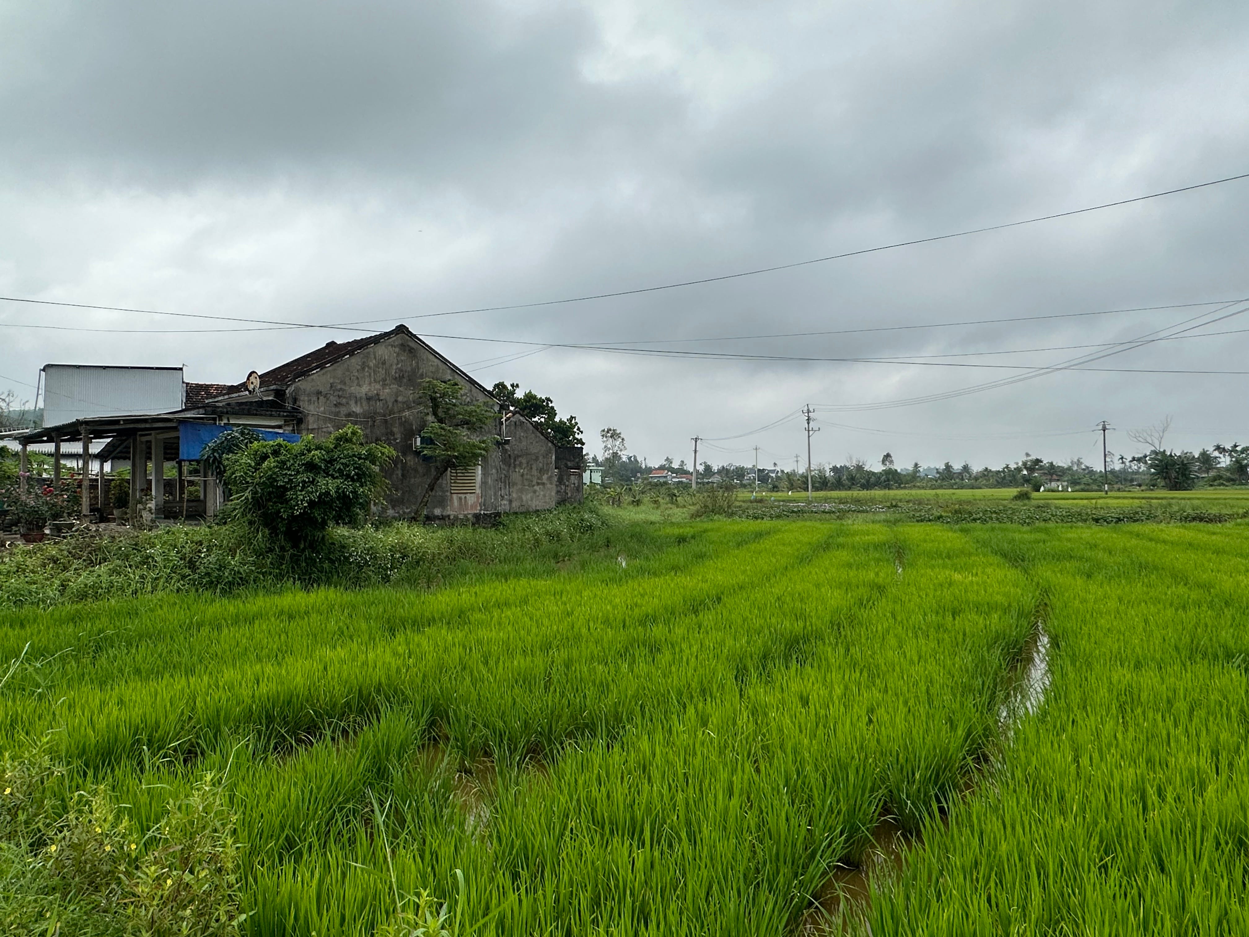 There was a gentle rain falling with dark clouds moving across the sky. There were puddles on the sidewalk where the elderly Vietnamese were sitting surrounded by coconuts, mangoes, papaya and bamboo. A small charcoal grill sat on the ground, cooking slivers of chicken attached to thin bamboo strips. The women smiled gently as we passed looking up from underneath the broad brims of their nón lá (leaf) hats. We turned right, and headed down a dirt road flanked by a long concrete wall and vegetation on the right. Along the left were simple homes. They were made from concrete and fronted by a courtyard and separated from the road by a gate. Next to the simple houses were small corrals made from wood and bamboo lashed together that held a couple of cows that mellowly and softly mooed. Each house had a small vegetable garden to its right filled with a tangle of fruit bearing vines and bushes.