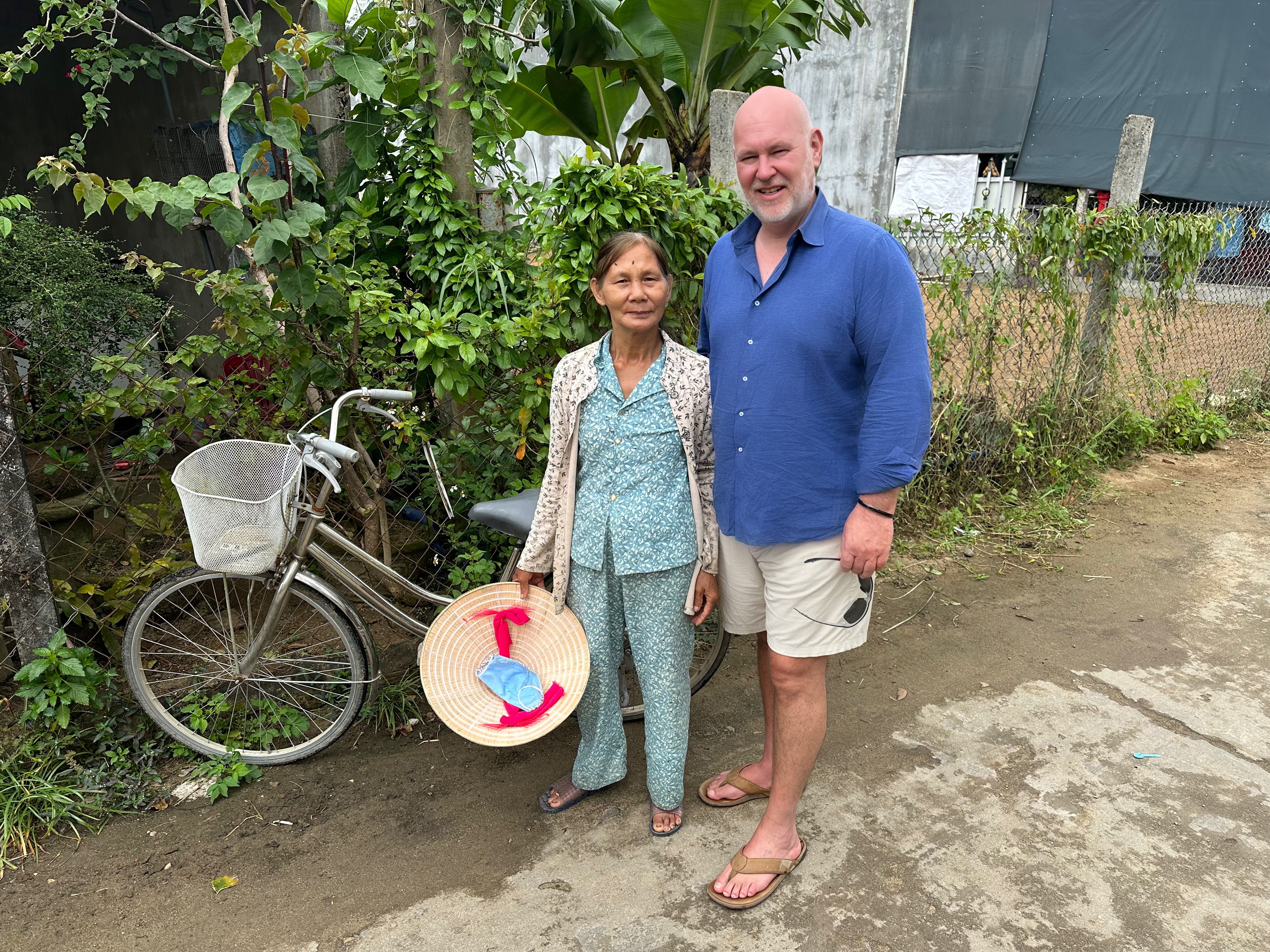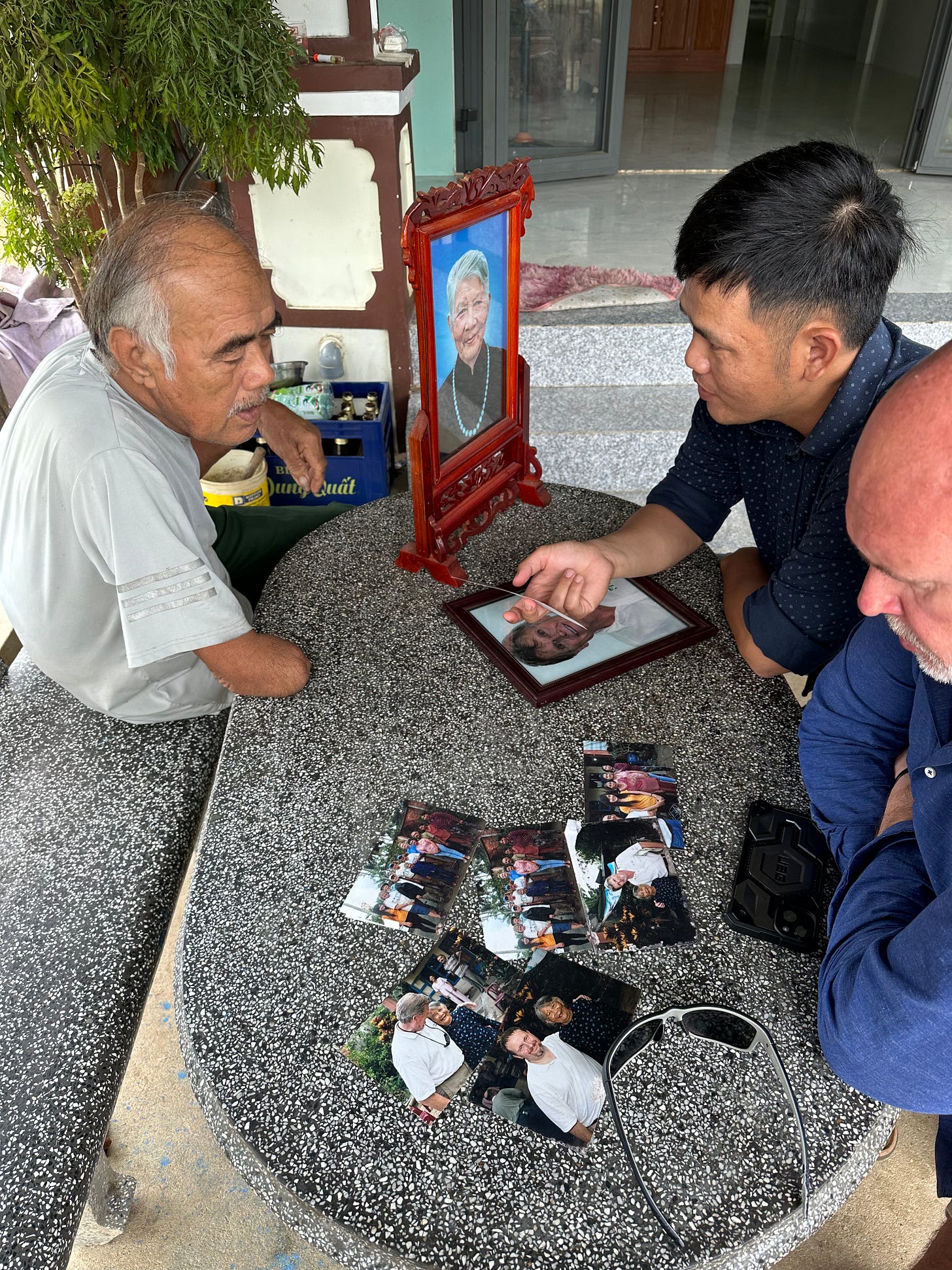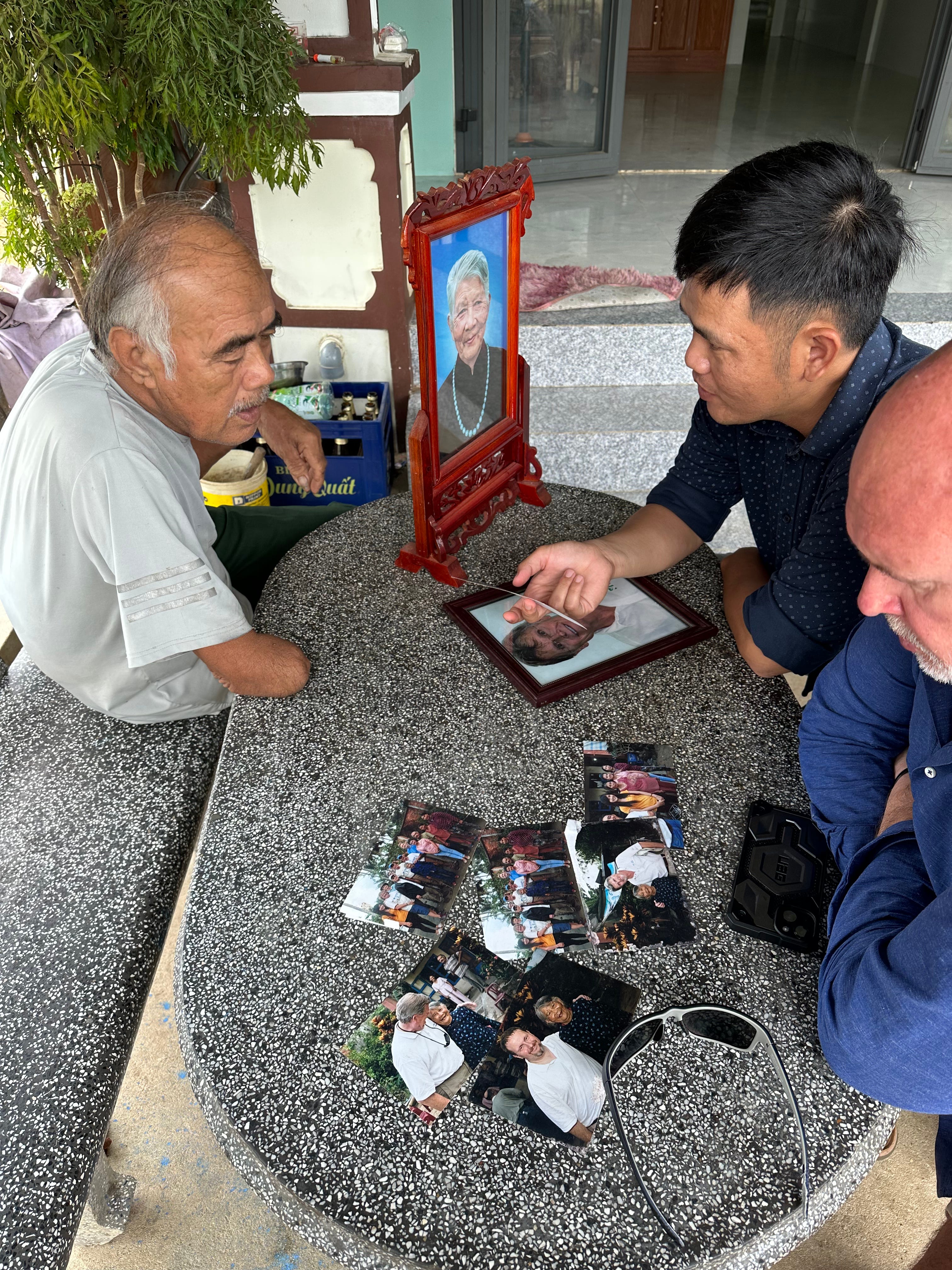 Đô Tân Thành was 14 years old on the day that the Americans came. He was severely wounded after being butchered by the war criminals. He lost his arm, leg and right eye. Yet, he was happy to see us. His smile was radiant as was that of his wife. They invited my Canadian wife and I into the courtyard and invited us to sit on a simple chair at a simple plastic table. Their granddaughter hurried off and returned with freshly sliced coconut and four glasses, and filled them with coconut water. Sau Thành (his nickname) went inside and came back with two pictures that were set next to each other on a mantel. One was of his mother, who survived that day, and the other was of an American veteran, who would return each year with other Americans and pay his respects to the survivors, and specifically his mother. When the American veteran died during Covid his widow sent his picture to Sau Thành, who placed it next to that of his mother. He said the veterans treated his mother like theirs, and so they were his brothers.